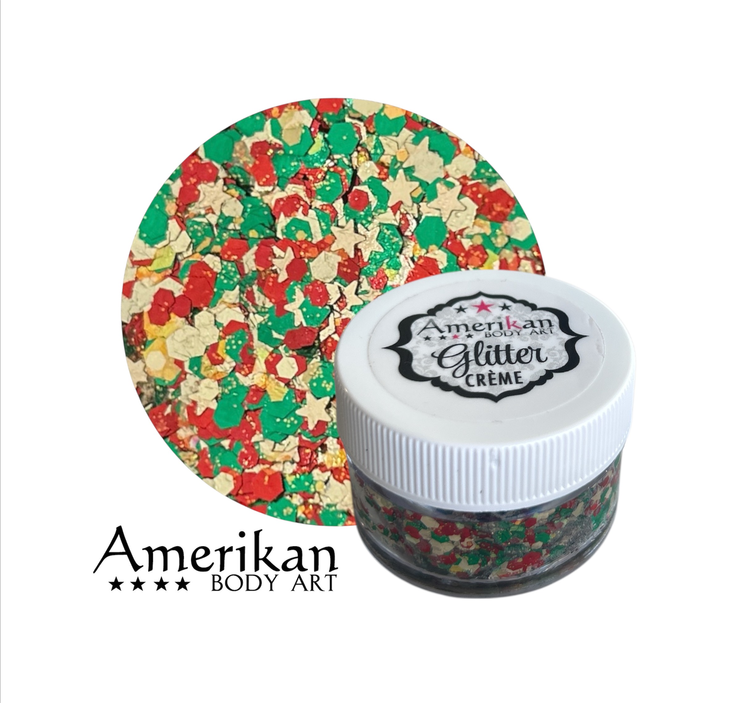 Our new soft formula glitter crème base is the the easiest base to use for your custom glitter crème creations. There is no heating/melting required. Simply weigh out your ingredients and stir. The ideal mixing ratio is 1 to 1 (i.e. 1oz glitter to 1oz crème base, by weight). This crème will be soft enough to apply with a brush. Our preferred brush is a nylon or taklon flat brush. It can be applied over water-activated face paints without smearing your paint.