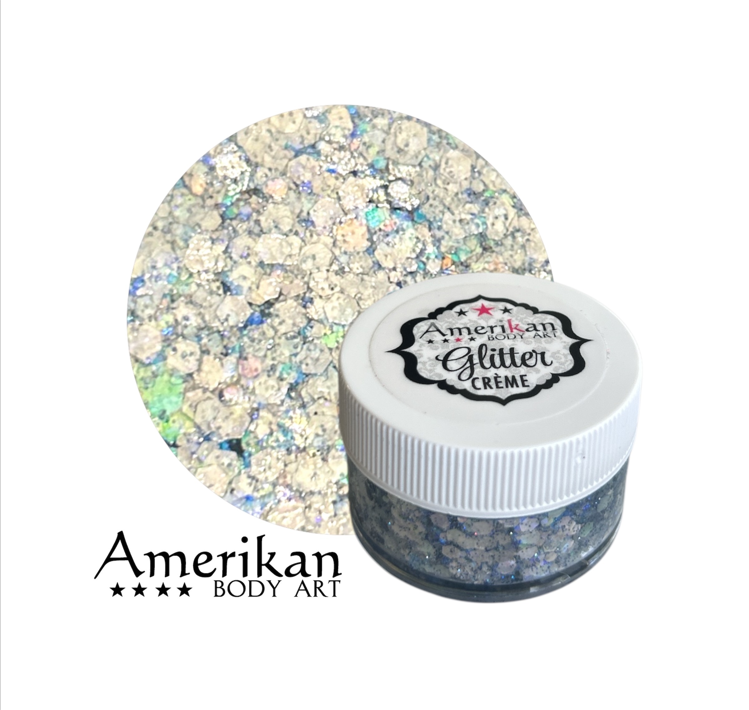 Crystal White is a specialty translucent glitter that looks white when it's packaged, but has a metallic reflection when it lays flat on skin. In bright light, the glitter reflects silver, which is why we have begun using this as a replacement for chrome silver in some of our glitter blends. In warmer light, the glitter reflects a slightly warmer silver color, almost a very light gold. We think it will be fantastic for facepainting and makeup creations. It does hold up well in both aloe and glitter creme bases.